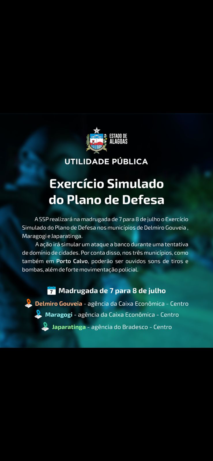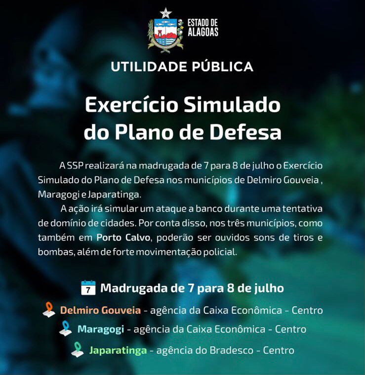 A Secretaria de Estado da Segurança Pública (SSP) realizará um exercício simulado do Plano de Defesa nos municípios de Delmiro Gouveia, Maragogi e Japaratinga. A ação ocorrerá na madrugada de 7 para 8 de julho, a partir de meia noite.